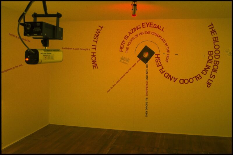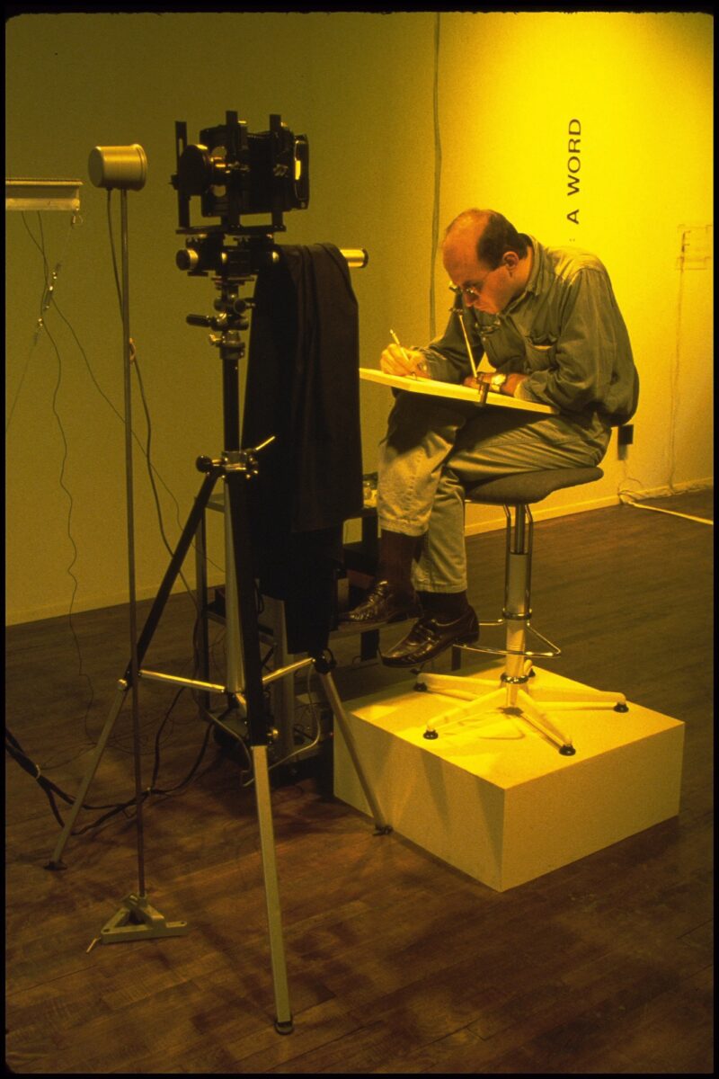 Tomas then reused almost all the elements of the Experimental Photographic Structures cycle – miniature train set, closed-circuit video, camera lucida – in different configurations. However, he grafted onto this system text fragments in vinyl letters – his own writings and those of other authors. Inspired by the Russian avant-gardes’ graphic design techniques of arranging sentences in all directions, he also reordered his diagrams. In many respects, Tomas’s artworks and writings the 1980s were contemporary with a critical re-evaluation of the history of photography conducted by artists who were also theoreticians (Victor Burgin, Jeff Wall, Martha Rosler, Alan Sekula). Yet, it is important to emphasize that until the 1990s, Tomas avoided explaining the tenets and results of his practice in the form of statements of intent, preferring to disseminate his anthropological research in a fragmentary or performative manner in the art field. He often required that only one visitor at a time be in the gallery space that was provided to him. When he was present, he remained silent. This withdrawal was at the opposite end of the spectrum from academic presentations before peers.