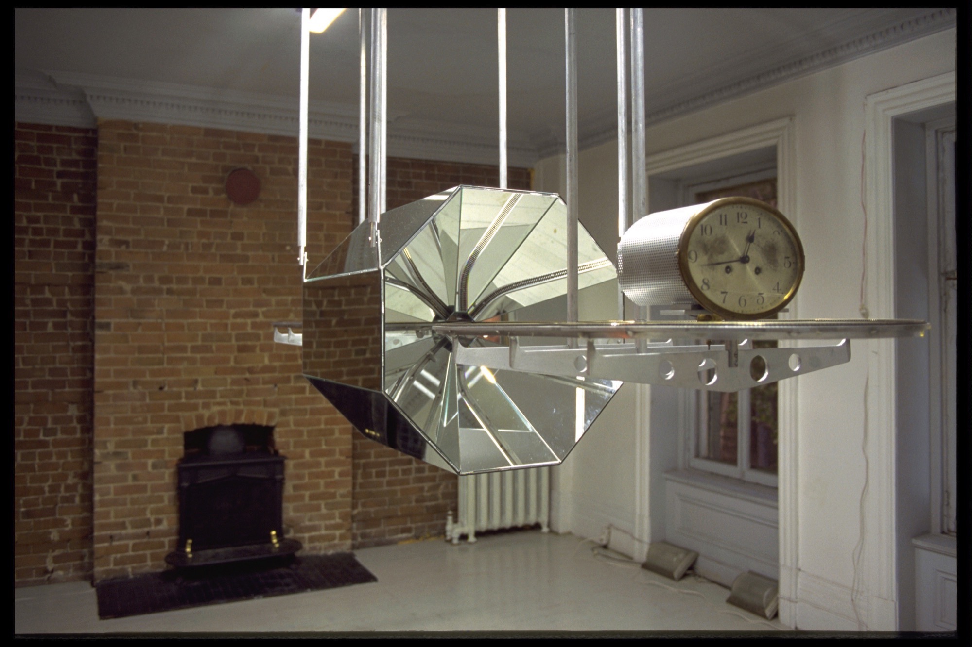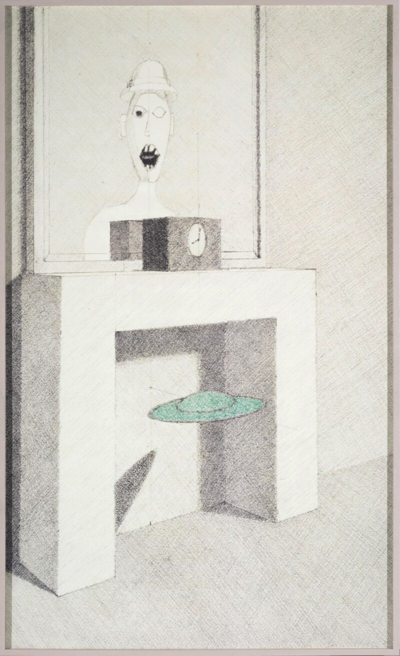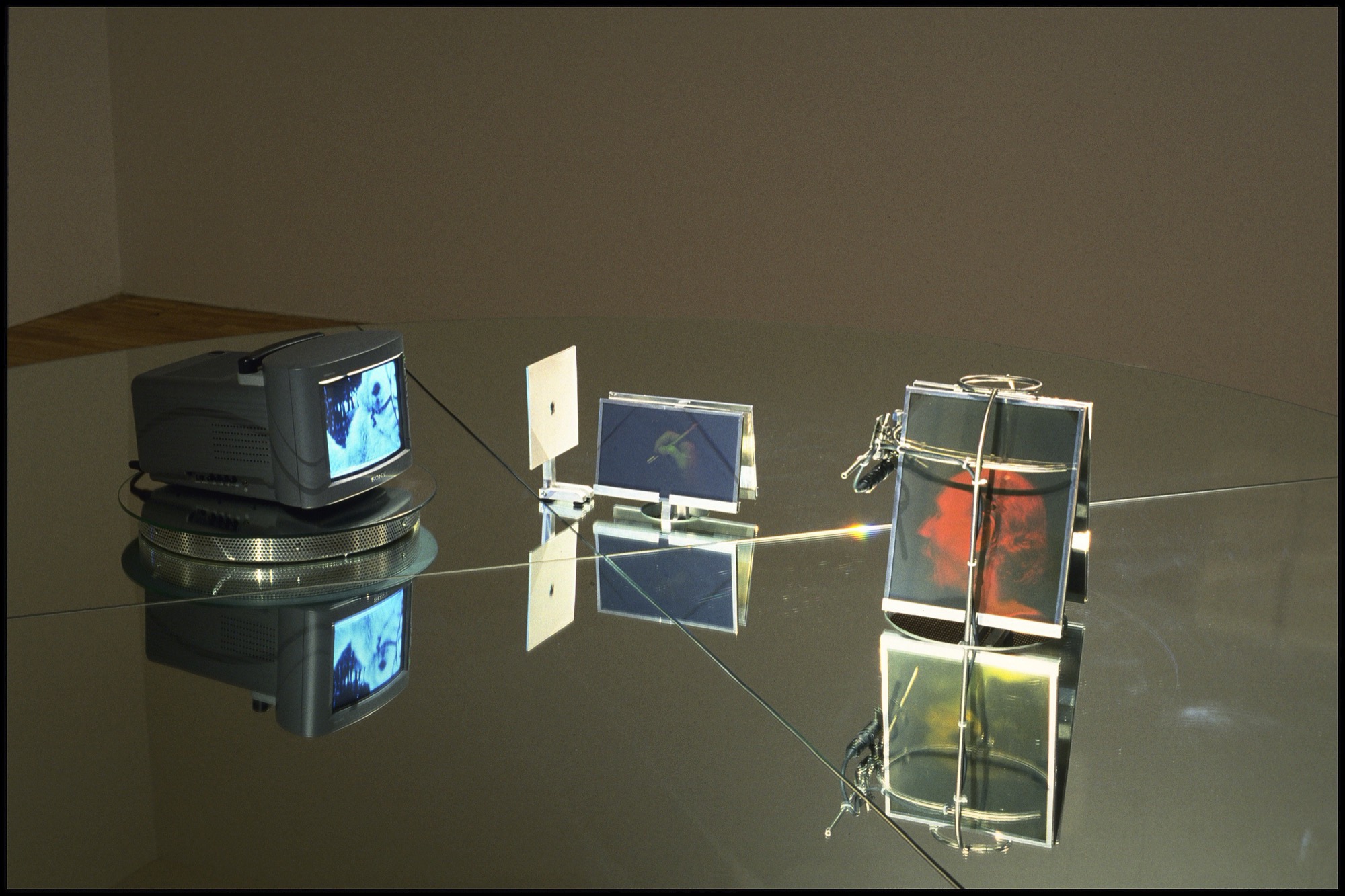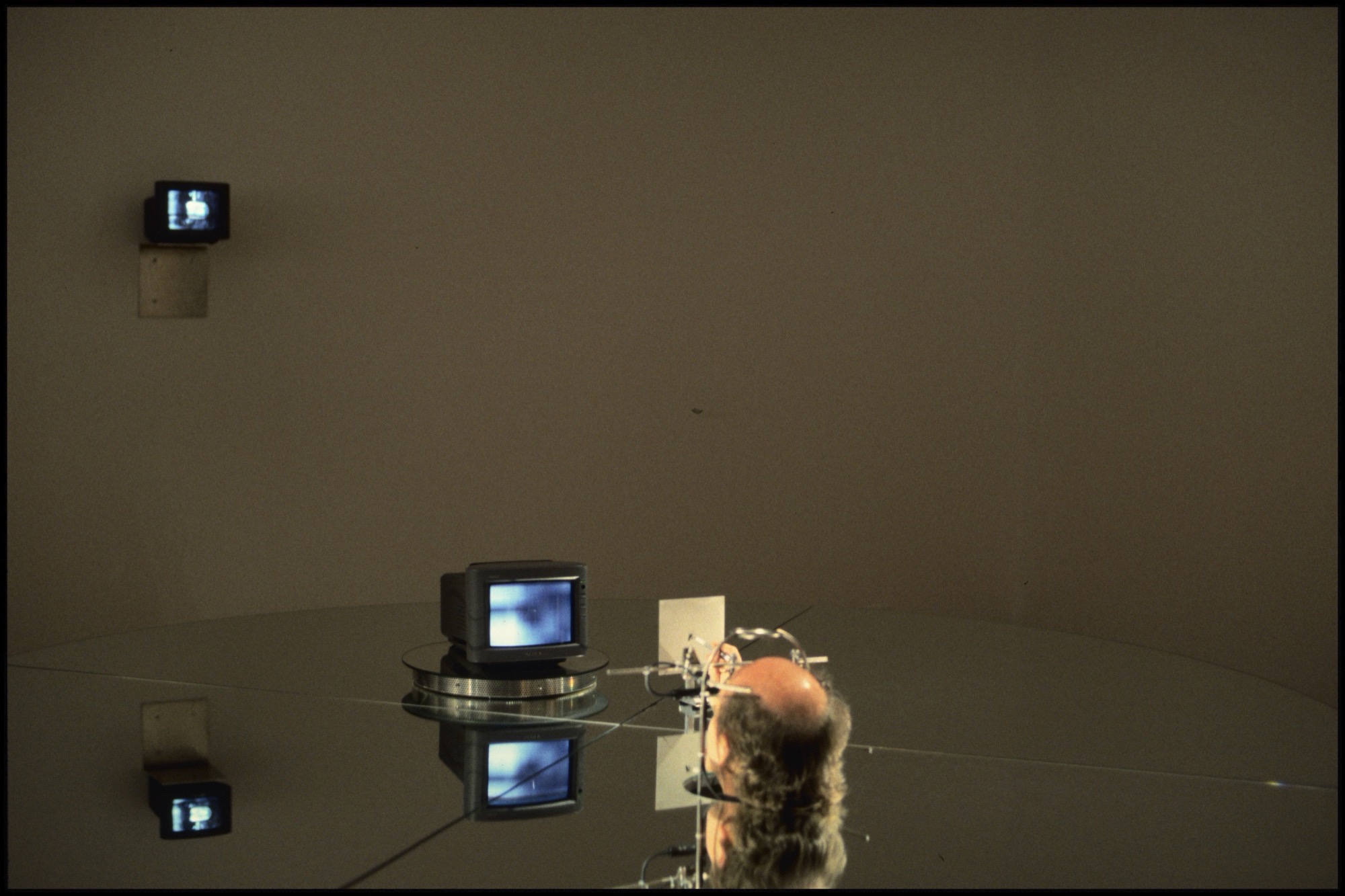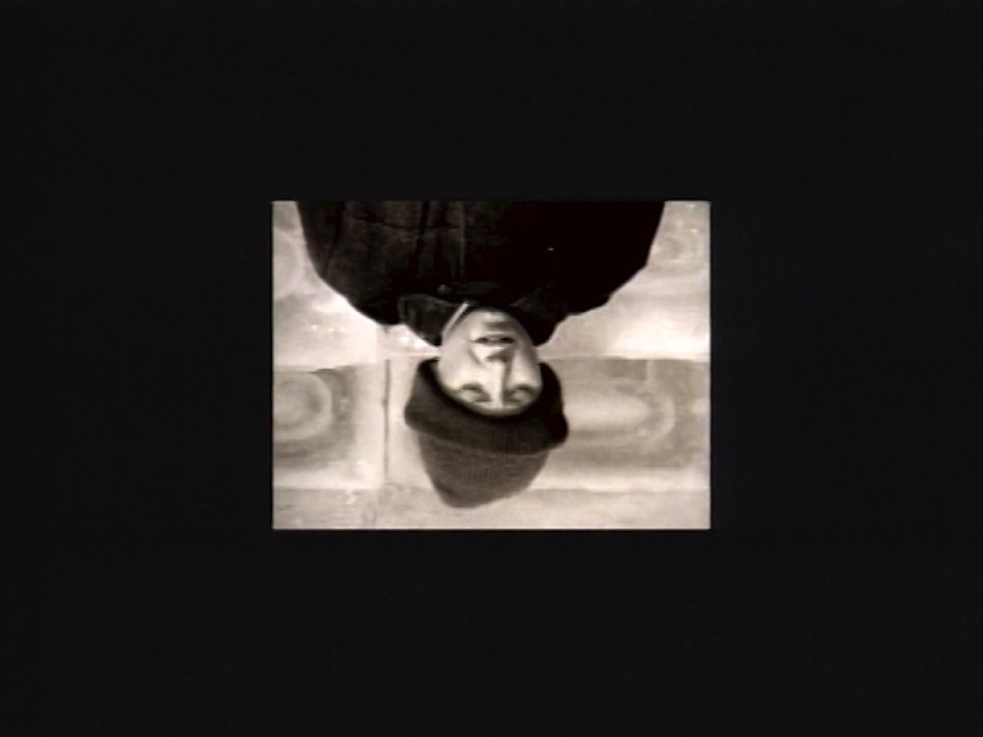 Elements of Rum and Coca-Cola had previously appeared in a 1990 drawing from Tomas’s cycle Time Transfixed (1976–94) based on an allegorical reading of René Magritte’s Time Transfixed (1938). Magritte’s painting situates a floating locomotive in front of a fireplace, on the mantelpiece of which are a clock and a mirror that doesn’t reflect anything. Tomas replaced the train with a flying saucer and had the Nicobarese scare devil emerge like a ghost in the mirror. This cycle was partly inspired by Tomas’s discovery of a collection of family snapshots in one of which he can be seen posing in front of a fireplace in his parents’ house beside a miniature train set. In another, he appears on a camel with a camera slung around its neck. During a performance (titled Time Transfixed IV in 1994, then The Incubator in 1998), Tomas appeared in a structure formed of a circular mirror that concealed his body, leaving only his head and one hand sticking out. A monitor attached to the reflective surface scrolled through the family pictures, zooming in quickly from the full frame of the photograph to one of the eyes of its subjects (him, his mother, his father, his sister). During the time when this detail occupied the entire field of his vision, Tomas, using a camera lucida, made a mark on a substrate. His perception, thus obstructed, was limited to the contours of this video. After the Time Transfixed IV/The Incubator performance, the drawing was displayed and holograms were substituted for the flesh-and-blood artist. These elements acted as more than simple documents, as his head was shown in profile, his mouth open, imitating the expression of the Nicobarese scare devil of the white man. For the catalogue for an exhibition of works from this cycle in 1994, at Oakville Galleries, he wrote an essay commenting on the chain of references by adding ethnographic signifiers to autobiographical fragments. Yet, in the exhibition space, this discourse was set aside in favour of a mute, impersonal encounter. Visitors discovered this “severed” head staring at the video loop in silence, as their own bodies were reflected upside down in the mirror.