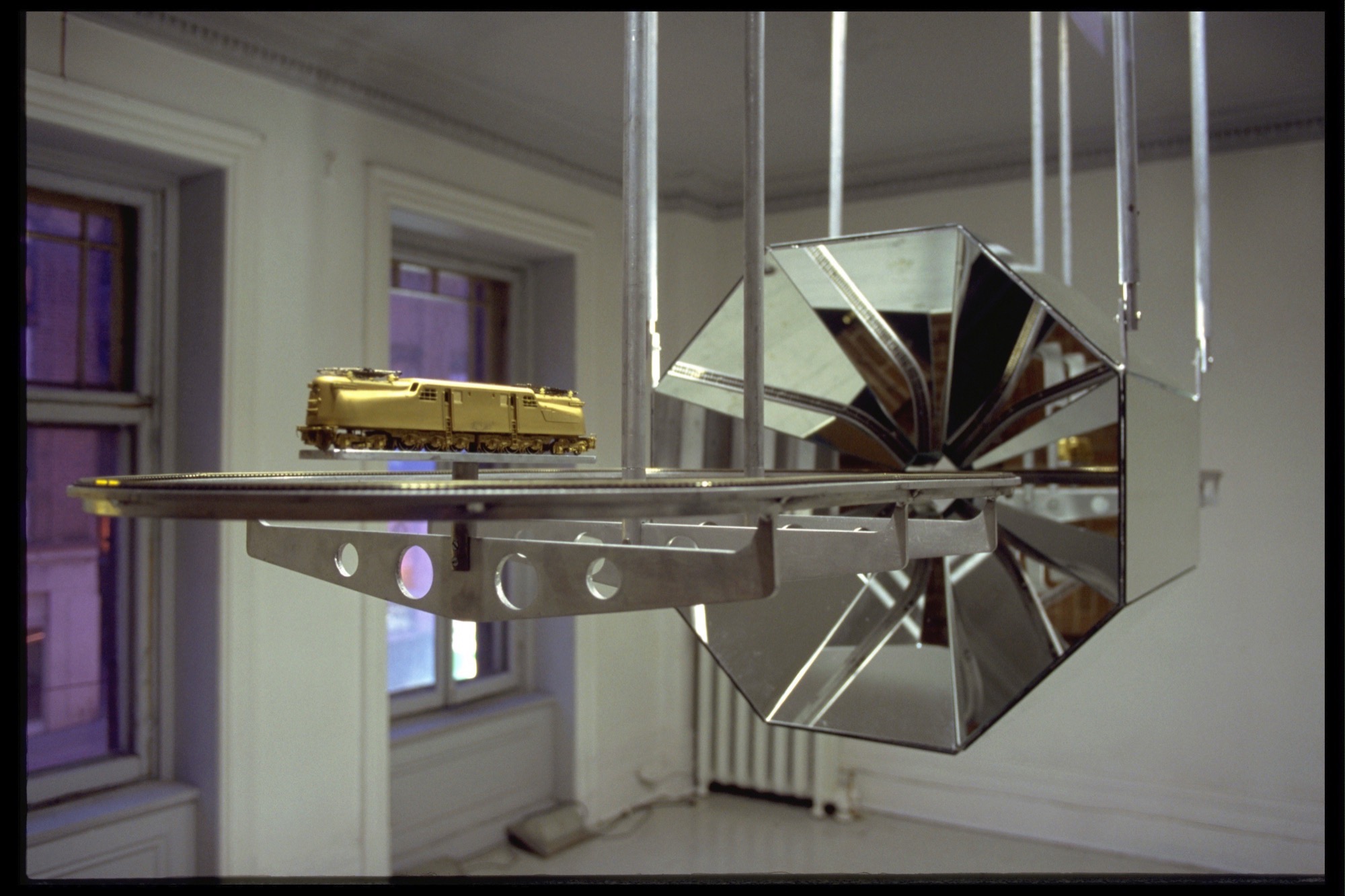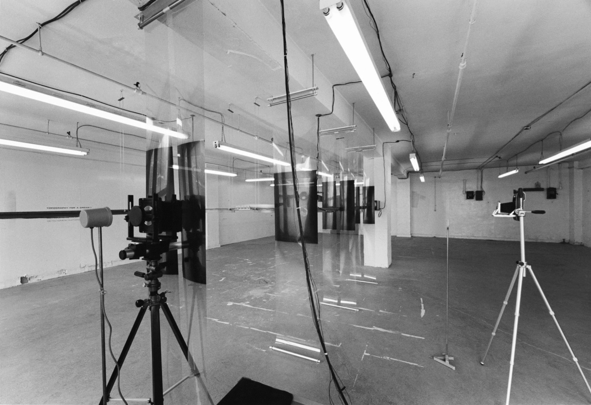 Extending the premises of his 1979 presentation with the series of installations Experimental Photographic Structure (1980–82), Tomas condensed the cultural space-time of the production of images to a continuous period of time in a single place. He programmed stroboscopes, chronometers, and automatic shutters that were connected to cameras so that Polaroid shots emptied of content (“raw, ideologically complex photographs”) were captured in a determined sequence. Between these components, he placed a closed-circuit video and a miniature train set. In one of the installations, he ob- served a part of the environment around him via a camera lucida (a nineteenth-century drawing tool, involving a prism and a lens, that projects a faint image of an object onto a sheet of paper). As a loco- motive crossed a bridge, triggering a flash, Tomas made a mark on a substrate. The black square resulting from this action, the tactile indication of a perception of blinding light, constituted the positive inverse of the white negative shots from the Polaroid cameras, generated without human intervention.4