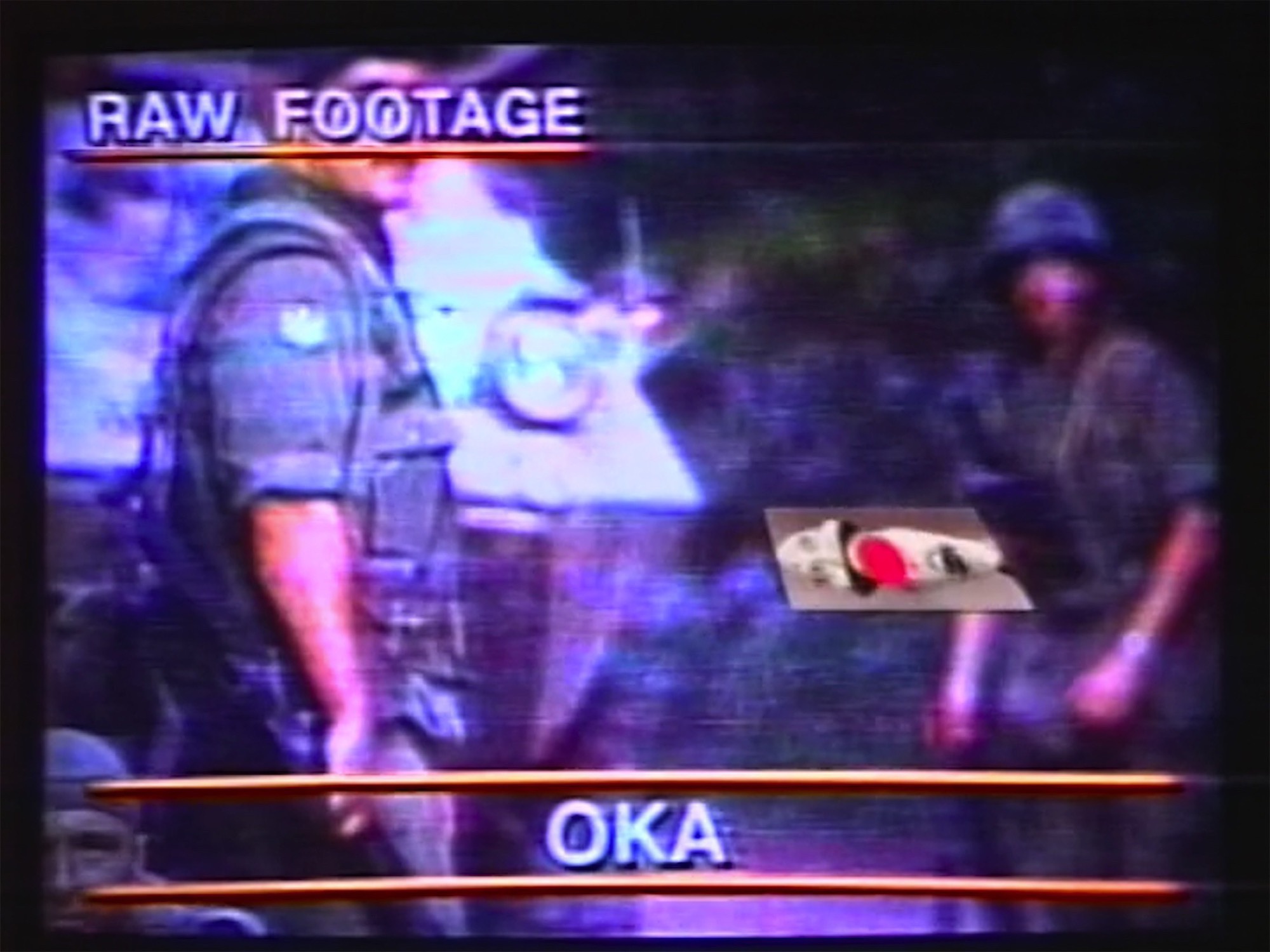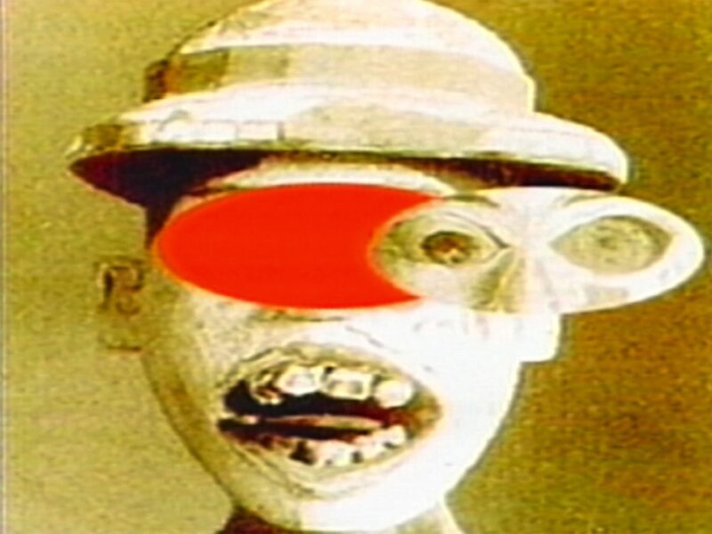 During the 1990s, Tomas began to look at the flaws in the reclaiming of the historical avant-garde by members of his own discipline, who saw surrealism as a model of reflexivity, at a time when artists like him were turning instead to social sciences (anthropology) methodologies to grant themselves greater agency. In the video Rum and Coca-Cola (1992), Tomas continued his study of intercultural spaces, this time juxtaposing contemporary political content – images of the 1990 Oka crisis captured on television – with ethnographic materials that he had previously employed. The soundtrack superimposed Rupert Grant and Lionel Belasco’s song Rum and Coca-Cola (1945) over dialogue from cold war–era sciencefiction movies evoking extraterrestrial invasions. Tomas intermittently inserted into the montage an animation of the head of a “scare devil” (hentakoi) representing a white man, sculpted in 1900 by the Indigenous inhabitants of the Nicobar Islands in the Indian Ocean. Hentakoi were fashioned to ward off evil spirits; they also put a face to the colonizer.