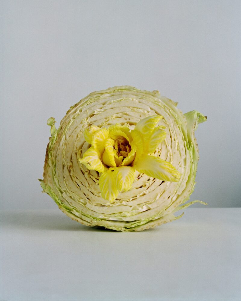Dans les œuvres de cet artiste, les aliments ne peuvent être considérés comme prêts à la consommation. Au gré des multiples œuvres qu’il a réalisées, on peut voir des ananas étrangement torsadés (série Pineapple), des choux bizarrement lacérés (série Cabbage Flower), une poire qui se noie (Pear and Glass Water, 2017), des bananes mutilées (Banana Flower #1, Banana in a Glass, 2005) et un reste de queue d’aubergine, racorni (Stalk of Eggplant on Bookshelf, 2009). Ils sont moins destinés à la consommation qu’aptes à évoquer le moment précédent, la préparation, ou le subséquent, sa mise au rebut (série Apple After Shaore). Ils sont en amont et en aval de toute consommation, encore plus que ne l’est la nature morte traditionnelle. Une fois transfiguré et ainsi posé parmi des objets familiers du quotidien, l’aliment acquiert une autre stature. Il se prête au jeu du sens, avant même d’être soumis à celui des sens.