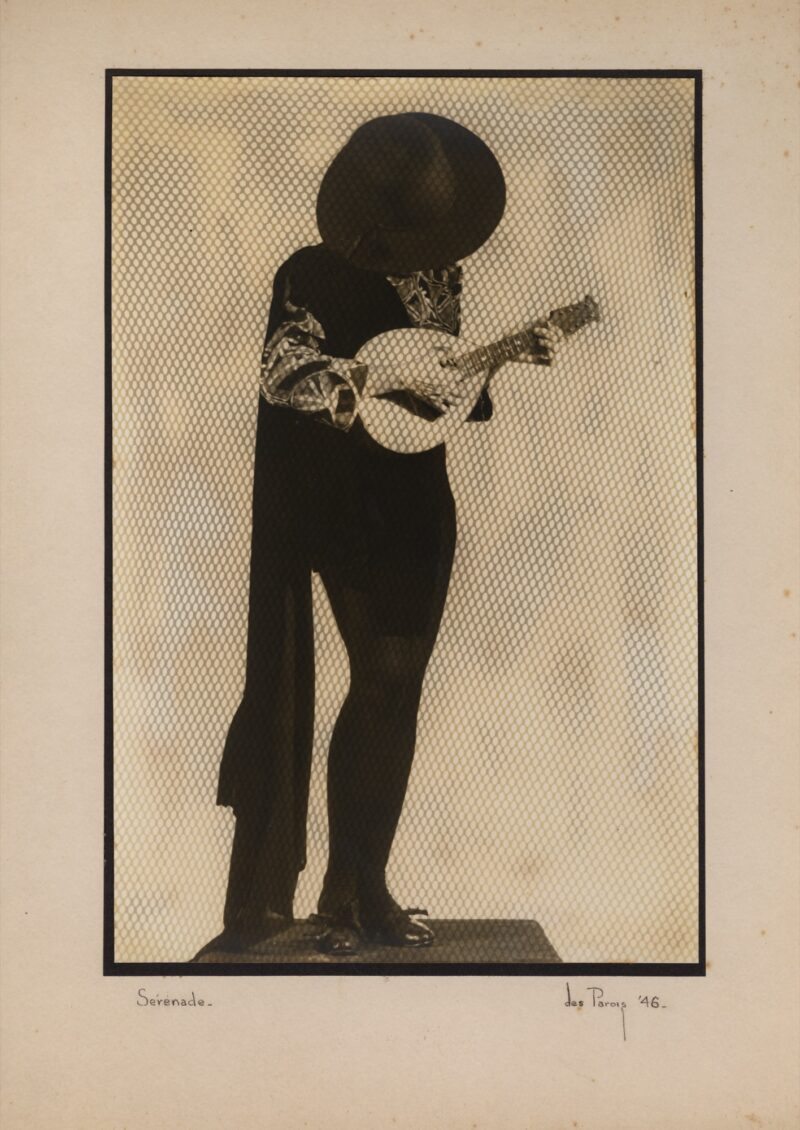 De 1949 à 1958, Desparois s’établit dans le Paris effervescent de l’après-guerre. Nos recherches font état de ses activités de photographe au service d’un recueil qui rassemble les poètes et intellectuels français en vogue. Alors qu’on le choisit pour illustrer la publication L’Éternel féminin, il travaille avec des créateurs et designers de la haute couture (Balmain, Dior, Ricci). En découle une quinzaine de compositions surprenantes, photomontages alliés de photogrammes visant à illustrer une proposition astucieuse : représenter les déesses de l’Olympe si elles descendaient sur les Champs-Élysées. On crée une muse moderne, Existentialie, en réponse au texte de Simone de Beauvoir Qu’est-ce qu’une Femme ? Le fil que l’on peut tracer dans le monde parisien se casse à peu près là, autour de la rue Rousselet…