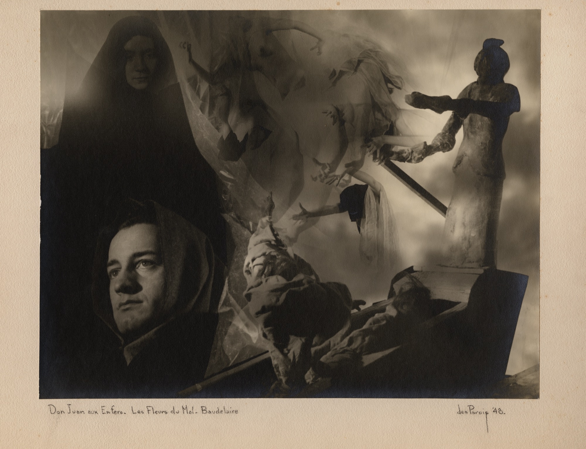 La période qui suit, cruciale, est la mieux documentée. En août 1948, Desparois expose son travail lors d’un accrochage éphémère dans les locaux du Passe-Temps. Dans une photographie qui relate l’événement, il apparaît devant une de ses images. On y reconnaît, accrochées sur un fil évoquant les laboratoires photographiques, Danse profane – Debussy et L’oiseau de feu – Stravinsky. Au moment où la communauté artistique est sur le qui-vive, deux semaines après le lancement du manifeste Refus global, Desparois présente pour la première fois une étrange série de photomontages à consonance surréaliste. Inspiré de poèmes d’Aloysius Bertrand et de Charles Baudelaire, ainsi que de la musique de compositeurs les plus connus – Beethoven, Chopin, Debussy, Ravel, Satie, Stravinsky, Wagner –, ce corpus d’une cohérence inédite fera sa renommée au Québec et à l’étranger. C’est de cet ensemble que sont issues la plupart des œuvres que nous avons retrouvées et que nous reproduisons ici, soit un mince échantillon de la trentaine de pièces qui composaient l’ensemble original.