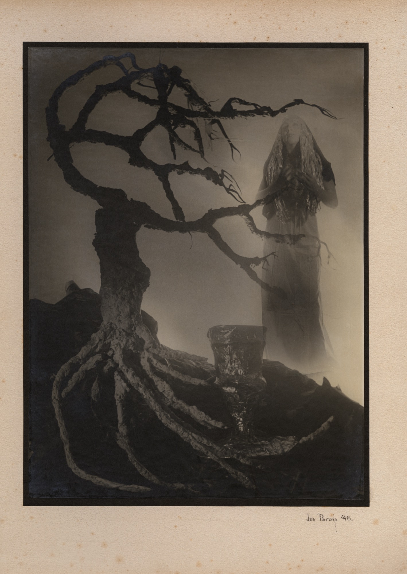 Dans le cadre de l’exposition de l’artiste Guillaume Adjutor-Provost intitulée Belles eaux1, nous avons été invité à montrer et présenter trois œuvres rares (des fac-similés) d’un ensemble d’exception que nous venions de découvrir. Acquis lors d’une vente aux enchères tenue en France en octobre 2020, il est composé de photomontages monotypes sur papier au gélatino-bromure contre-collés sur un grand carton fort. Signées et datées entre 1946 et 1948, ces œuvres remarquables n’avaient pas été vues à Montréal en plus de soixante-dix ans. Leur auteur demeure jusqu’ici pratiquement inconnu des historiens. Son nom : Évariste Desparois.
