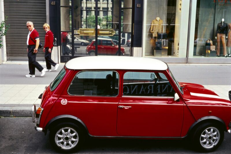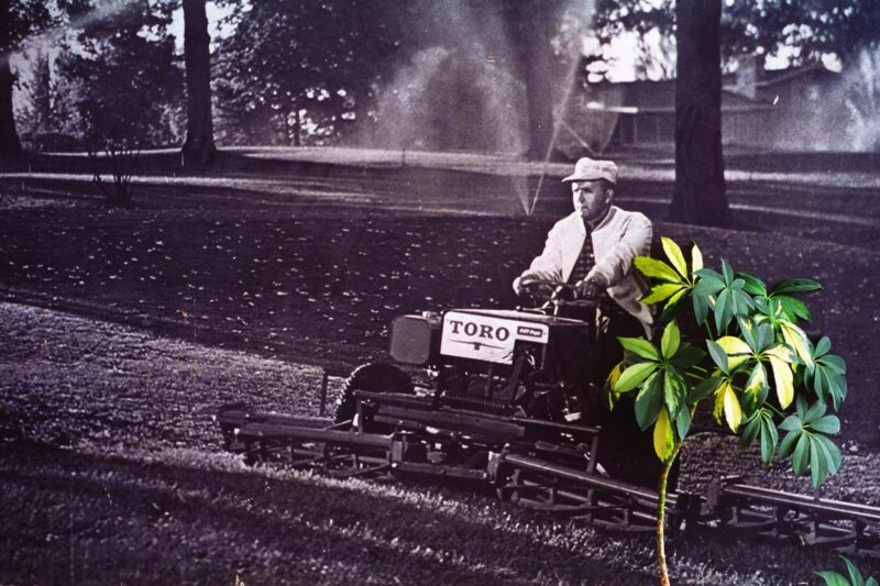 Un jour de cette même année, j’ai rendez-vous dans une entreprise qui vend tout ce qui a trait à la pelouse. En arrivant à l’accueil, je m’assois face à un grand poster en noir et blanc qui couvre entièrement le mur : c’est la photographie d’un homme qui tond une immense pelouse sur un petit tracteur. Je remarque un détail assez croustillant. Je demande donc à la femme qui m’a accueilli si je peux me permettre de prendre une photo. Elle me demande pourquoi. Alors je lui explique que l’on dirait que l’homme qui tond la pelouse a devant lui, au premier plan, une vraie plante qui est en fait une plante de bureau posée là par hasard. Et soudain elle perçoit l’ironie de la situation et éclate de rire. Je peux prendre la photo. Elle me remercie ensuite, m’expliquant que je lui ai ouvert les yeux, car elle travaille ici depuis quatre ans et n’avait jamais remarqué cela. C’est un vrai plaisir que de vivre des petits moments comme celui-ci.