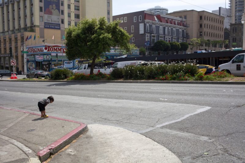 Dans sa critique du penchant surréaliste de la photographie – qui est à ses yeux son essence –, Susan Sontag écrivait des photographes américains qu’ils « sont souvent en vadrouille, submergés par un étonnement irrespectueux devant ce que leur pays a à leur offrir en fait de surprises surréelles. Moralistes et pillards sans scrupules, enfants et étrangers dans leur propre pays, ils prennent note de ce qui est en train de disparaître2.» Cette description coïncide assez bien avec certains aspects de la pratique de Franck Gérard. En revanche, il n’y a chez lui aucune nostalgie à l’égard de ce qui disparaît. Bien au contraire, ses photographies captent la drôlerie parfois grinçante de l’existence, la forme dans laquelle l’instant de nos actes et de nos émois se fige en une image, sans que nous nous en doutions. Nulle nostalgie romantique ou benjaminienne dans cette offrande de la vie au regard du photographe. Chez lui « shooter » une photo s’apparente au jeu plutôt qu’au sérieux de la mort, c’est un geste qui rend hommage à l’appétit joyeux d’immortaliser des instants d’innocence. On peut aussi rapprocher le travail de Franck Gérard de celui de Raymond Depardon, mais à condition de noter une inflexion distincte : également curieuses de ce que l’on pourrait appeler la vie des gens, ses images se révèlent moins politiques que celles de son aîné et davantage ironiques. Elles appartiennent en cela sans doute à une autre génération du regard photographe, lorsque, déjà conscient de son immersion dans le flux des images, il perçoit la fragilité même de leur sens.