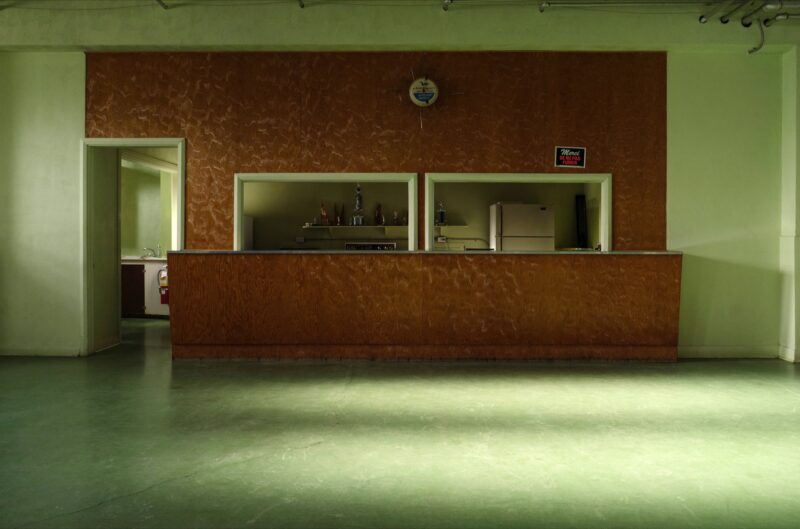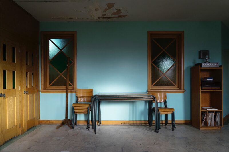 C’est d’abord par une expérience des lieux que ce récit prend forme. Depuis la cage d’escalier jusqu’à la sacristie, en passant par le comptoir de cuisine, le coin évier et la pièce repas, on entre dans l’espace de la galerie comme si on entrait littéralement dans la salle paroissiale, tant la transposition de cette dernière est méthodique. Étrange climat, où la surface érodée des murs, du plafond et même du plancher est criante et nettement mise en relief par la photographe. Dans cet endroit rudimentaire et désert, seuls les supports à manteaux, l’empilement de chaises droites et le linge à vaisselle déposé sur le bord de l’évier suggèrent qu’une activité humaine a eu ou aura lieu.