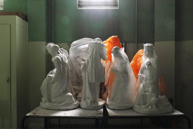 L’efficacité de la mise en espace des images en fournit la pleine mesure. Point fort de l’exposition, ce dispositif spatial donne véritablement sens et corps au propos de l’artiste. De grands formats photographiques tapissent les murs, ouvrant un dialogue entre objets usuels, objets de culte et les aires minimalistes du sous-sol d’église. S’entremêlent ainsi chandelier, cuillère, pots à crayons, cintre, trophées, fleurs séchées en forme de nature morte, ou encore maquette d’église, boîtier sacré, personnages d’une crèche soigneusement emballés et tabernacle revêtu d’un voile blanc finement brodé. Saisis isolément et en plans très rapprochés, ces objets captivent par leur forte charge d’affect et d’énigme. Ils sont surtout révélateurs d’un lieu à la fois de rituel, de recueillement, de loisir, de socialisation et de savoir-faire au sein d’une communauté déterminée à y entretenir un sentiment d’appartenance, voire un terreau identitaire.