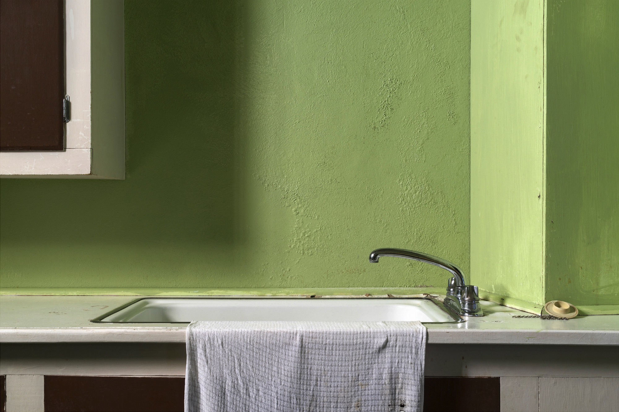 Pourtant, en circulant devant ces pièces énigmatiques et d’un autre temps, une étonnante sensation de quiétude nous enveloppe. Certes, l’effet sibyllin dans le jeu des ombres et lumières, le vert irlandais qui drape l’ensemble des images, les prises de vues frontales et les plans rapprochés de chacun des clichés contribuent, avec leurs inclinaisons picturales, à cette impression d’enveloppement. De même, pour l’omniprésente géométrie des formes – quasi moderniste – que soulignent avec insistance les lignes horizontales de l’évier, du comptoir et de l’étagère à trophées, faisant de la symétrie des plans d’ameublement une sorte d’espace contrôlé et rassurant.