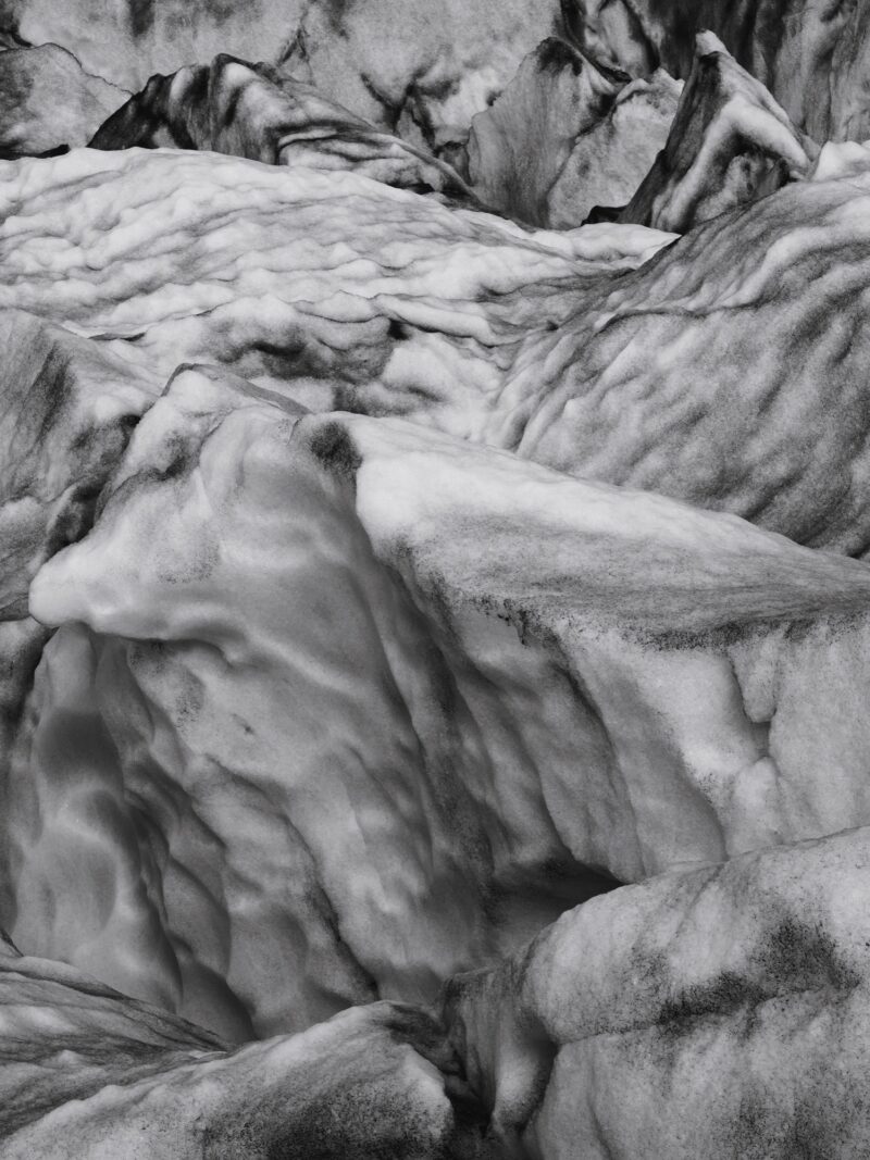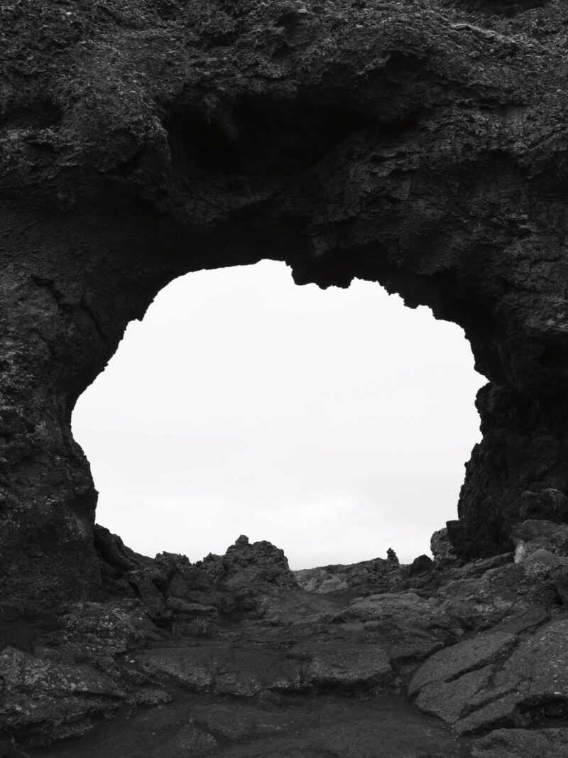 La référence à l’univers sonore se retrouve également dans le titre du livre : 12 hertz (Hz) est la plus basse fréquence que puisse percevoir l’ouïe. C’est donc dire que l’artiste explore les frontières du perceptible et de ce qu’il est possible de comprendre grâce aux sens. Il en va des ondes sonores comme des forces qui façonnent les paysages. Celles-ci se manifestent dans les souterrains, modulées par des phénomènes dont le déploiement dépasse largement l’histoire humaine. Ces mouvements, imperceptibles et impossibles à photographier directement, Jude les explore en relevant leurs impacts sur la nature : des champs de lave aux glaciers, des vagues frappant les littoraux et falaises aux cheminées volcaniques enfumées, en passant par les grottes de calcaire ou celles sculptées de stalactites, c’est paradoxalement une force en mouvement que l’on saisit dans l’immobilité du roc qui compose une grande partie des photographies.