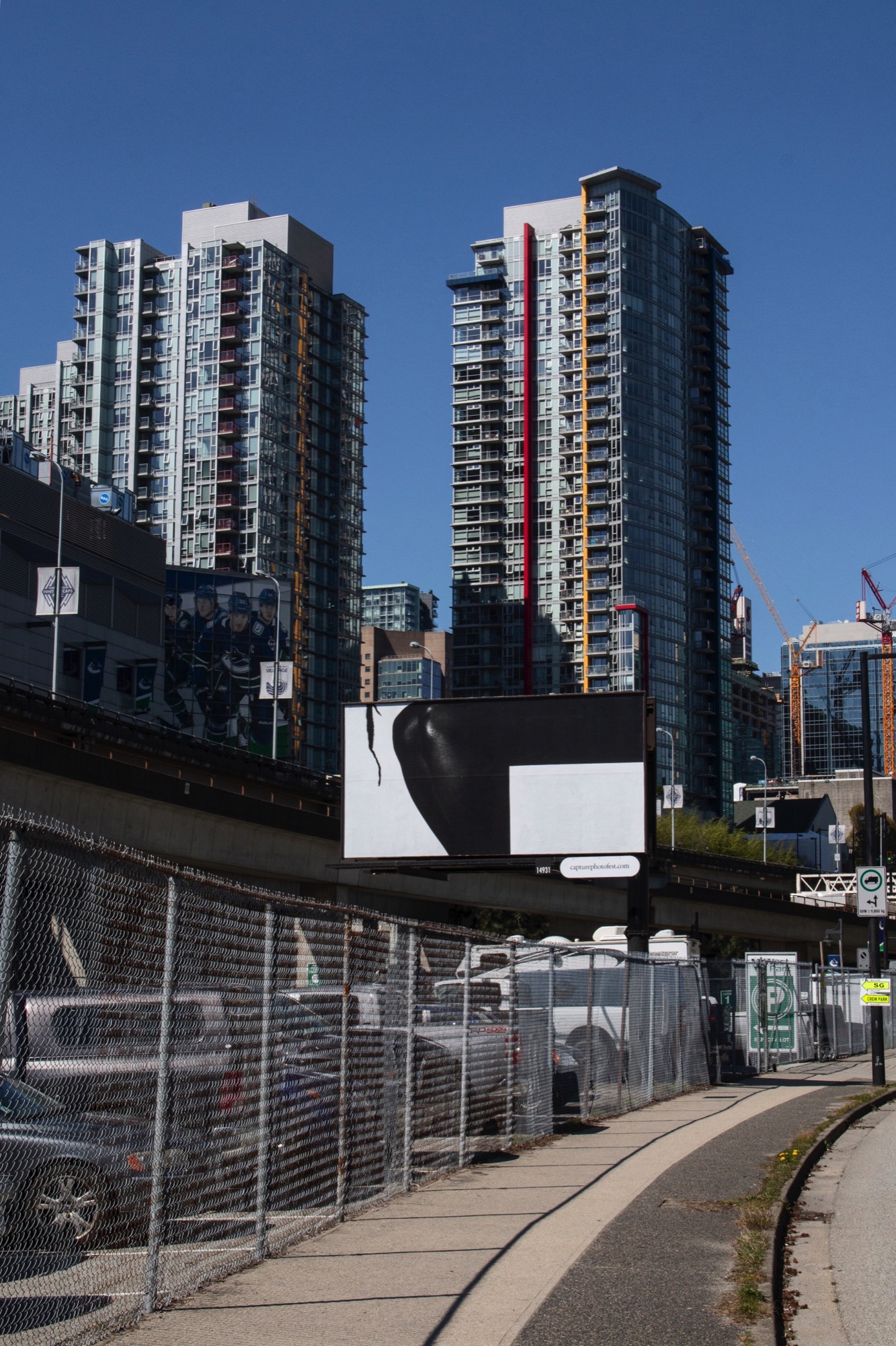 Les panneaux sont d’une dimension telle qu’on ne peut les manquer dans le paysage urbain. Des œuvres d’Anique Jordan sont présentées sur Expo Boulevard le long de la baie de Northeast False Creek, sur fond austère de viaducs et de tours bétonnées. Les deux images, aux recto et verso d’un même panneau, semblent au premier regard des abstractions en noir et blanc. Mais si vous marchez ou êtes arrêtés au feu de circulation, vous distinguez les reflets et contours d’une peau noire et une mèche de cheveux étroitement enroulés. Ces images sont les plus minimalistes de la série Darkie (2018), qui associe plans d’un blanc immaculé et corps féminin noir. Les œuvres se caractérisent par les contrastes – blanc, dur, rigide/noir, organique, vulnérable – et en ce sens perturbent l’abstraction qu’elles évoquent. Jordan qualifie sa création de hantée, « habitée par ce qui ne peut être représenté ». En ce temps et en ce lieu, les panneaux accusent silencieusement une perte tout en proclamant leur présence en lien avec l’espace patriarcal de développement, l’histoire de l’art et l’impératif de Black Lives Matter.