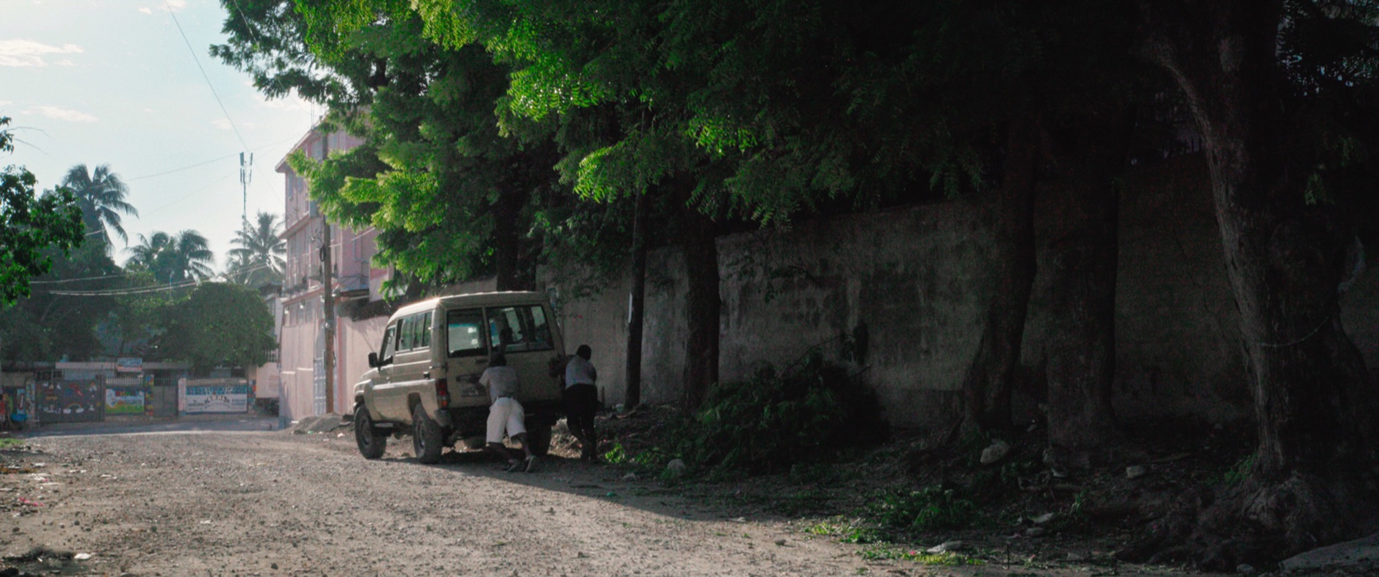 Pas de guerre annoncée, certes, mais un climat insurrectionnel, parfois survolté, agite les rues de la capitale haïtienne au moment du tournage en 2019, avec souvent le nom du président Jovenel Moïse écrit sur les murs, et assorti d’insultes. Ce panorama se déploie devant la caméra de Licha, mais à distance, et doublement cadré : d’abord par l’image, ensuite par les fenêtres d’un de ces nombreux et robustes « 4 × 4 » qui ratissent la ville, très prisés des organisations humanitaires. Et de plus en plus par la police locale.