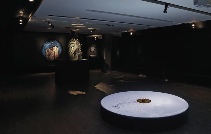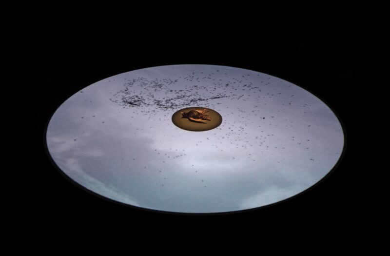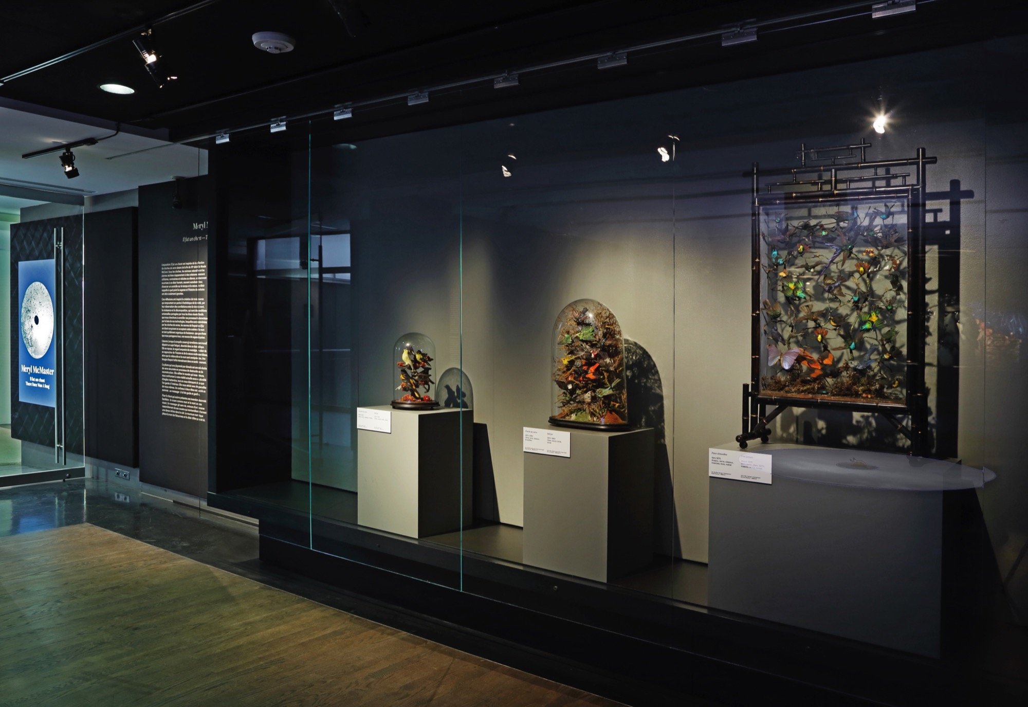 En entrant dans l’exposition, le public est accueilli par des bruits de forêt : un cours d’eau, des feuilles qui bruissent et, périodiquement, le cri perçant d’un corbeau qui résonne dans la salle. Créées au cours d’une résidence au Musée McCord, les œuvres de cette exposition interagissent avec des objets de la collection de l’institution : trois vitrines du 19e siècle remplies d’oiseaux naturalisés. L’un de ces articles surprenants, monté dans un cadre en faux bambou qui témoigne des goûts orientalistes de l’époque, ne contient pas moins de trente spécimens. Ce cas particulier est un pare-feu, conçu pour faire dévier la chaleur d’une cheminée de salon, mais les deux autres sont des cloches de verre ; leur forme ronde constitue une clé pour le reste de l’exposition.