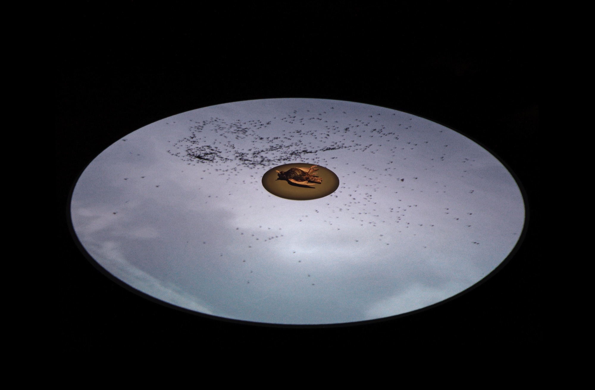 La dernière œuvre de cette petite et riche exposition est peut-être la plus poignante. Un étourneau repose, ventre en l’air, au centre d’un disque illuminé. Autour de lui, un vol d’étourneaux animé par ordinateur se rassemble et prend son élan. La nuée est un peu plus pixélisée que ce qu’on voit sur l’affiche de l’exposition, mais l’effet est néanmoins envoûtant. Je me souviens de la commande d’Abbas Akhavan pour la Biennale de Montréal 2014, dans laquelle il avait montré huit animaux disposés dans des positions qui, contrairement à la convention taxidermique, renvoyaient à la mort. Bien sûr, tous les oiseaux de l’exposition de McMaster sont morts, mais cet étourneau est le seul à l’admettre – ou plutôt, nous oblige à voir les autres comme sans vie. Et c’est là que l’entière implication du titre de l’exposition devient épouvantablement claire. Il y a déjà eu un chant. Peut-être n’y en a-t-il plus ? Toutefois, c’est passer à côté de l’essentiel que de considérer cette installation comme purement pessimiste. La mort, selon McMaster, est un processus naturel, bien que déconcertant, et plutôt que de la nier (en mettant par exemple des oiseaux naturalisés dans des globes de verre), nous devrions plutôt apprendre des cycles de la vie. Oui, l’étourneau est mort, mais le titre de cette pièce, For The Song That Is To Follow, promet la continuité.