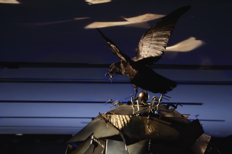Il fut un chant marque la première fois où McMaster présente une sculpture en tant que telle, bien que sa pratique photographique implique depuis longtemps la fabrication de costumes aux structures élaborées. Son intuition évidente en matière de matériaux se manifeste dans une autre œuvre de l’exposition, The Feather That Tomorrow Will Form. Au-dessus d’une pile bombée de miroirs fumés se perche un corbeau bicéphale qui, malgré sa mutation incroyable, constitue la pièce naturalisée la plus convaincante de la salle. Les cris d’oiseaux rauques que les visiteurs ont entendus semblent venir de l’intérieur de la structure. McMaster qualifie cette œuvre d’« anti-globe de verre » parce qu’elle est réfléchissante au lieu de transparente, dentelée, désordonnée et non lisse. Bien que nous essayions de deviner une ouverture, nous n’avons pas accès à ce qui est à l’intérieur. Le corbeau, qui est filou et guide dans la cosmologie nêhiyaw, déjoue nos investigations empiriques et nous pousse à changer notre attitude. Aussi fascinante que soit cette sculpture, son impact est quelque peu diminué par le fait qu’elle est exposée sur un socle haut qui pousse l’oiseau à deux têtes contre le plafond bas, limitant visuellement l’envergure de ses ailes.